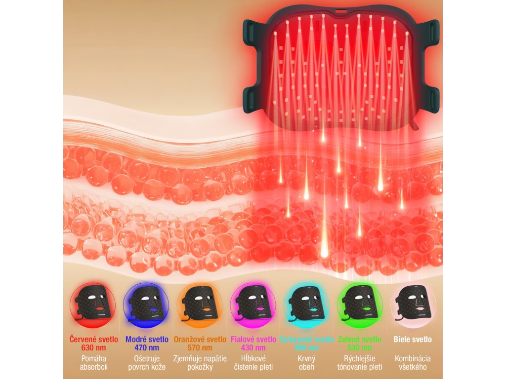 - červené svetlo 630nm, modré svetlo 470nm, oranžové svetlo 590nm, fialové svetlo 430nm, azurové svetlo 490nm, zelené svetlo 530nm, infračervené svetlo 850nm